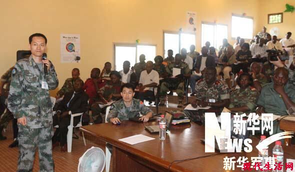 6月19日,“和平天使—2009”中国与加蓬人道主义医疗救援联合行动进入专业培训阶段。图为中国人民解放军总后勤部卫生综合局局长、中加联合行动现地总指挥李瑞兴大校介绍了我军卫生人员参加汶川特大地震灾害医学救援的一些经验做法。新华军事记者 李刚 摄