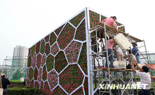 9月5日,工作人员在北京东单路口搭建“水立方”造型花坛。新华社发(陈晓根 摄)