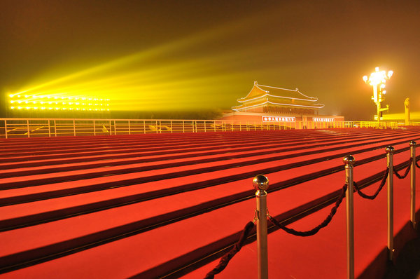 北京天安门广场红色盛装亮相迎接国庆