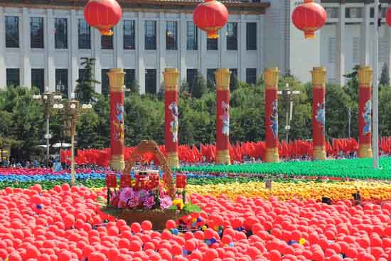 “明天更美好”方阵中5000多名少年儿童手持彩色气球、花环走向天安门前的中心区。新华社记者郭大岳摄
