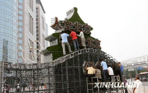9月5日,工作人员在北京东单路口搭建“水立方”造型花坛。新华社发(陈晓根 摄)