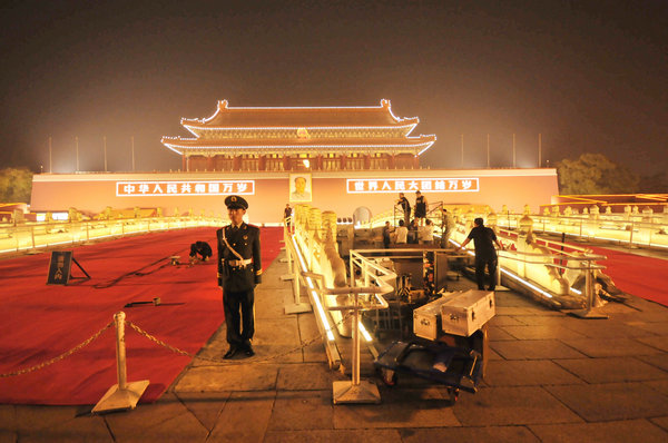 天安门广场国庆阅兵各项准备工作紧张有序进行。