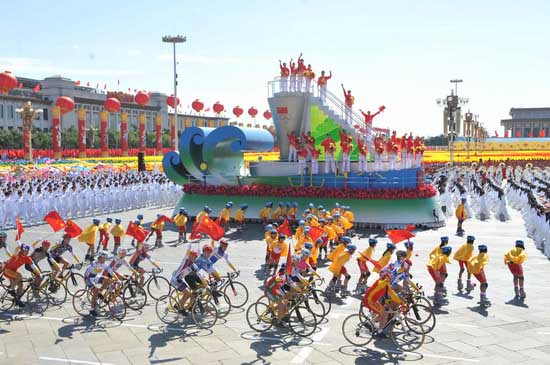 10月1日,首都各界庆祝中华人民共和国成立60周年大会在北京举行。这是“体育发展”方阵通过天安门广场。